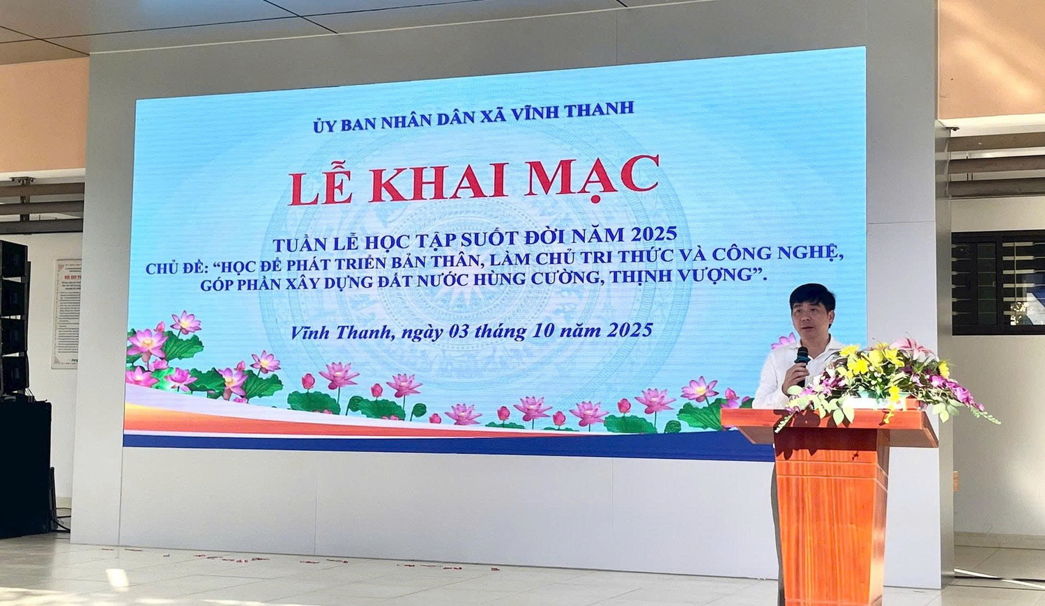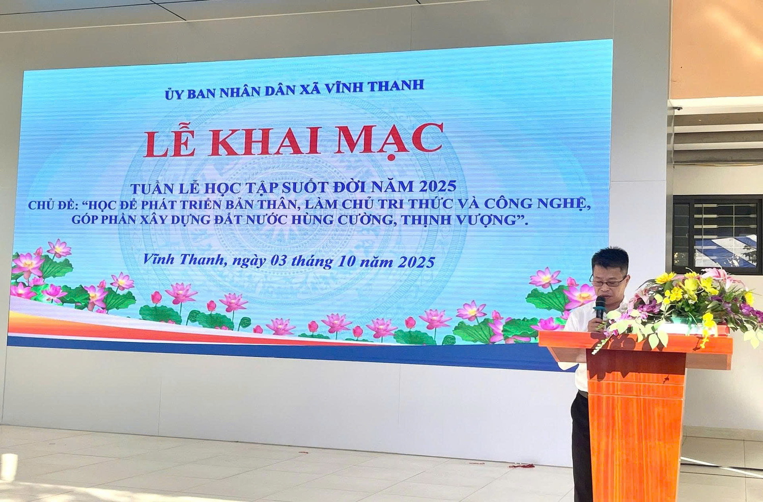 Phát biểu khai mạc, Phó Chủ tịch UBND xã Vĩnh Thanh Trần Đình Ngọc cho biết, Tuần lễ hưởng ứng học tập suốt đời là hoạt động ý nghĩa, nhằm khơi dậy tinh thần hiếu học trong cộng đồng, xây dựng xã hội học tập, tạo điều kiện cho mọi người dân được học tập thường xuyên, liên tục, học tập suốt đời. Chủ đề năm 2025 khẳng định vai trò then chốt của tri thức, khoa học, công nghệ đối với sự phát triển của mỗi cá nhân, gia đình và đất nước trong thời kỳ hội nhập.