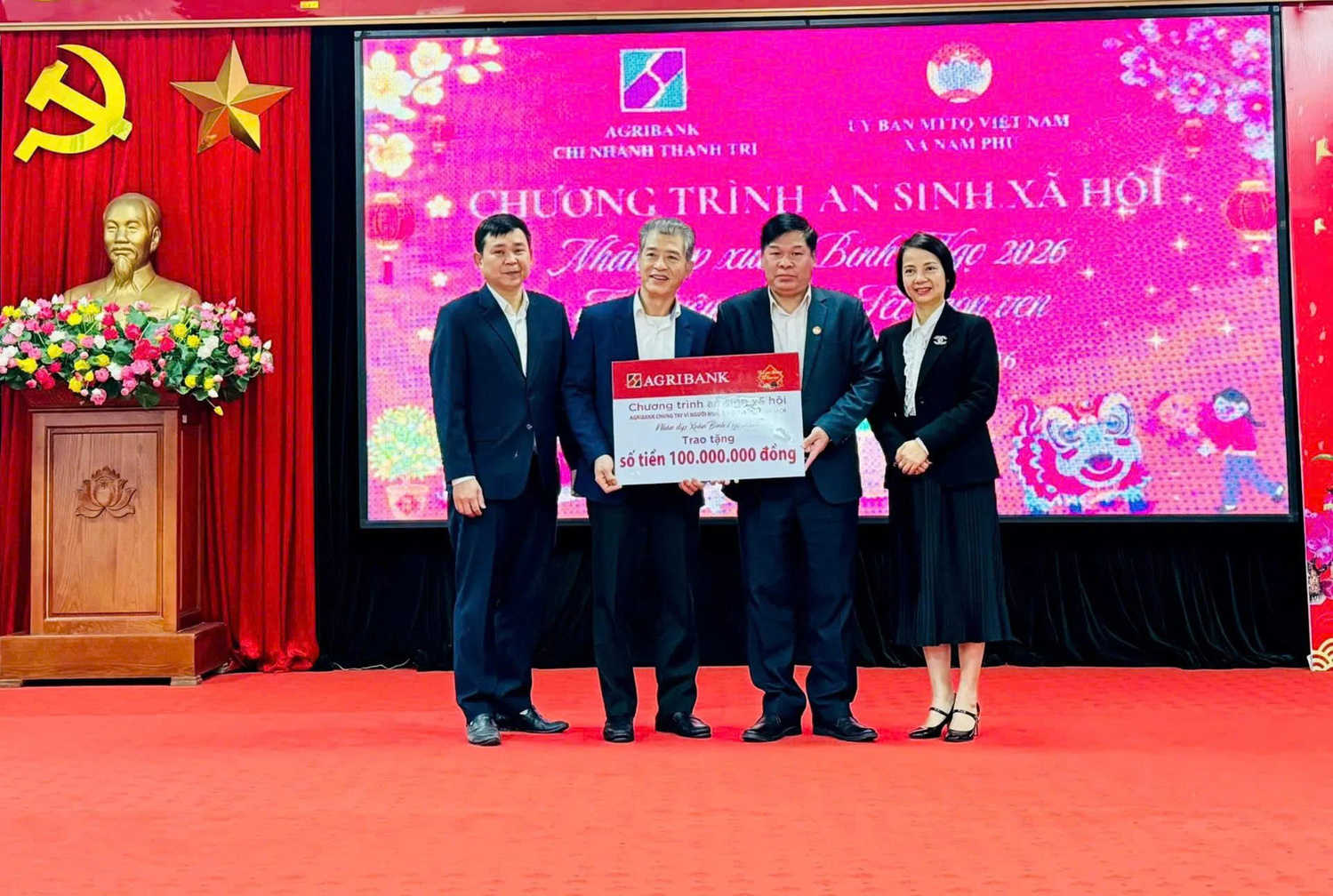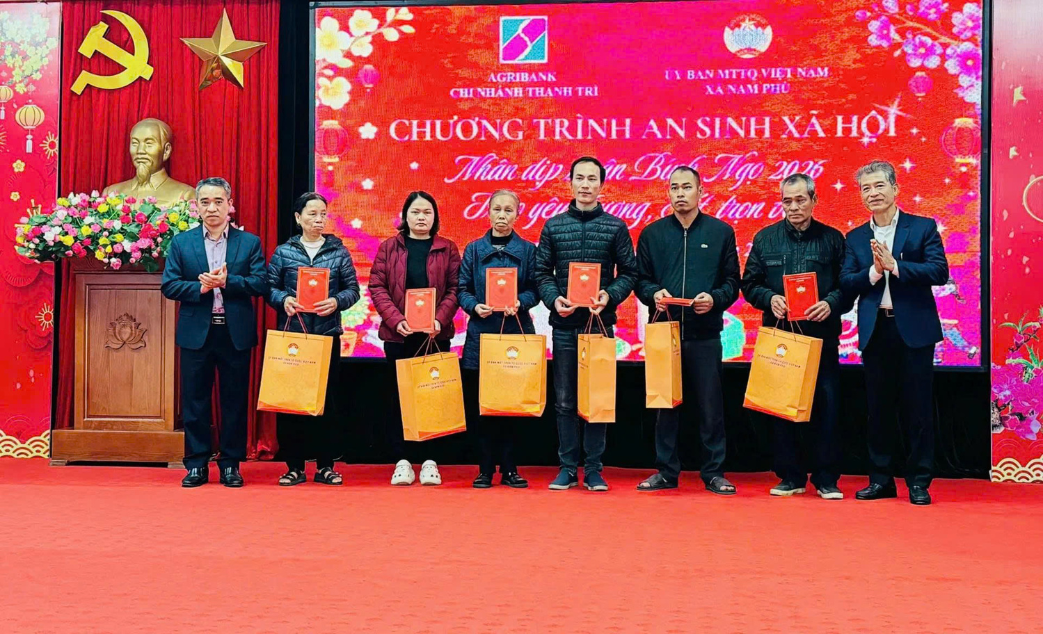Lãnh đạo xã Nam Phù và lãnh đạo Agribank trao quà cho các hộ khó khăn Tại chương trình, Agribank Chi nhánh Thanh Trì đã trao hỗ trợ 100 triệu đồng để địa phương tổ chức tặng quà Tết cho các hộ khó khăn. Trên cơ sở rà soát, Uỷ ban MTTQ Việt Nam xã đã lập danh sách và trao 200 suất quà đến đúng đối tượng, bảo đảm công khai, minh bạch, kịp thời trước thềm năm mới.