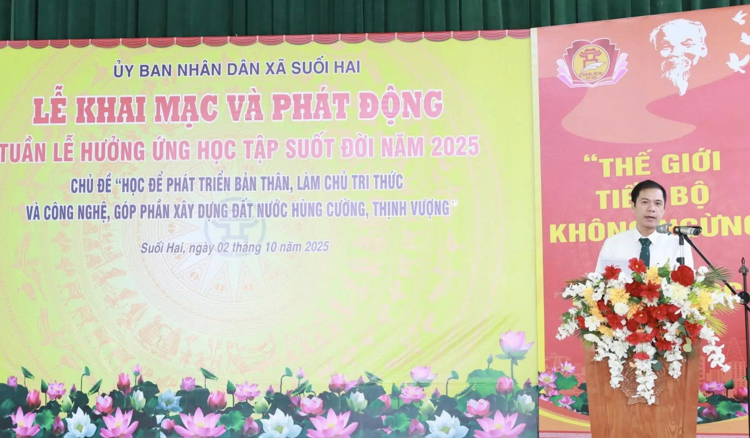 Phát biểu Lễ khai mạc và phát động, Phó Chủ tịch UBND xã Suối Hai Lê Hào Quang cho biết, Tuần lễ hưởng ứng học tập suốt đời năm 2025 là dịp để tôn vinh, gìn giữ và phát huy truyền thống hiếu học của quê hương; tuyên dương những tấm gương học tập tiêu biểu, khuyến khích tinh thần tự học, học tập suốt đời trong mọi tầng lớp nhân dân trên địa bàn xã Suối Hai.