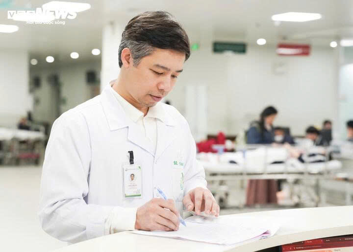 Ở Trung tâm Phẫu thuật Đại trực tràng - Tầng sinh môn, Bác sĩ CKII Phạm Phúc Khánh có hơn 16 năm làm việc tại Việt Đức. Một ngày trực của anh bắt đầu bằng việc phân công kíp mổ, hội chẩn ca khó và thường kết thúc khi trời đã sáng hôm sau. “Mỗi ngày khoa cấp cứu tiếp nhận khoảng 150-200 ca. Trong đó 30-35 ca phải mổ khẩn cấp, chưa kể tiểu phẫu”, anh cho biết.