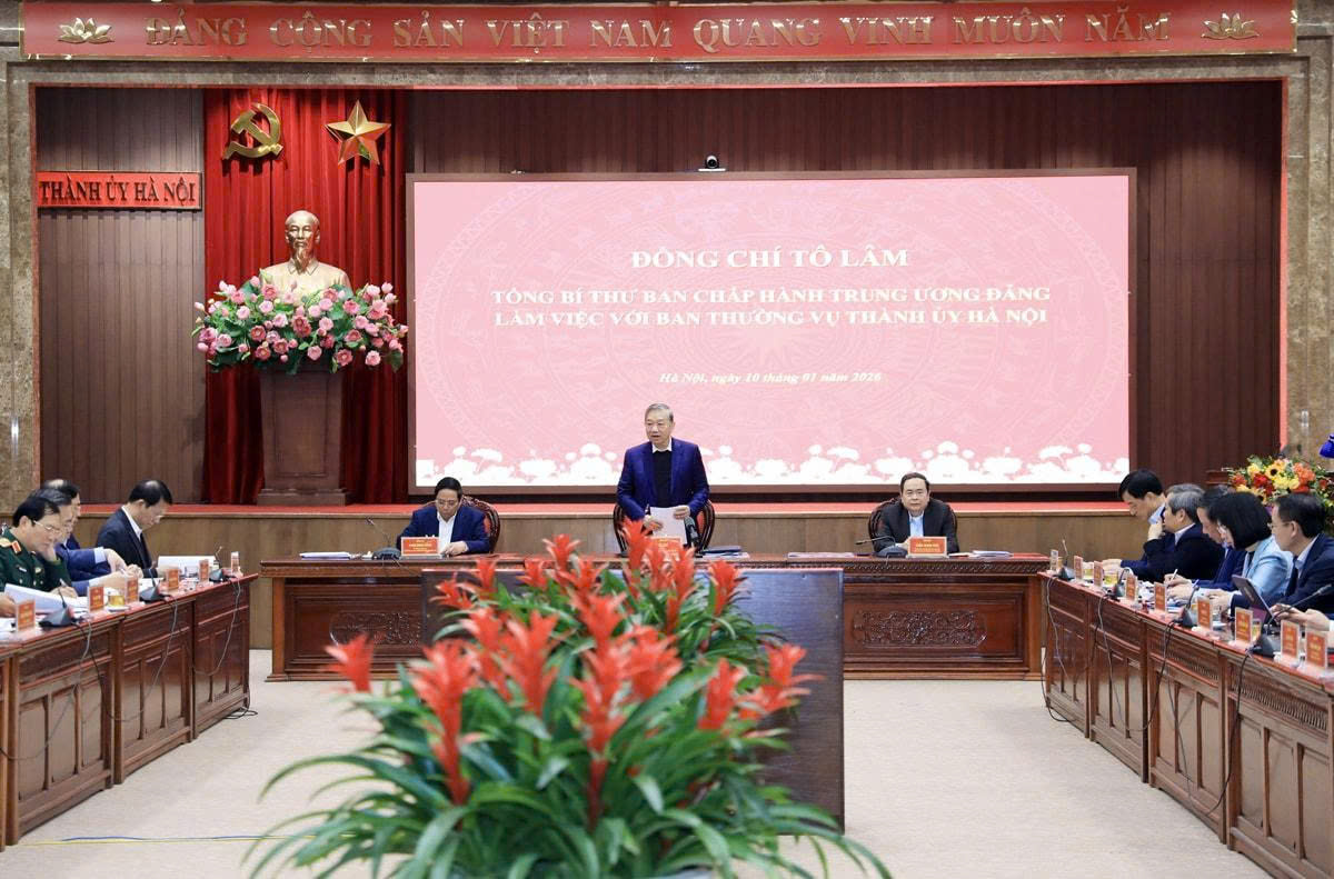 Phát biểu chỉ đạo, Tổng Bí thư Tô Lâm nhấn mạnh, buổi làm việc với Ban Thường vụ Thành ủy Hà Nội diễn ra trong bối cảnh toàn hệ thống chính trị đang chuẩn bị các điều kiện tổ chức Đại hội đại biểu toàn quốc lần thứ XIV của Đảng. Đây cũng là dịp để xác định rõ vị trí, vai trò và sứ mệnh của Thủ đô Hà Nội trong giai đoạn phát triển mới. Trong đó, Hà Nội được đặt đúng vào vị trí chiến lược đối với sự phát triển chung của đất nước.