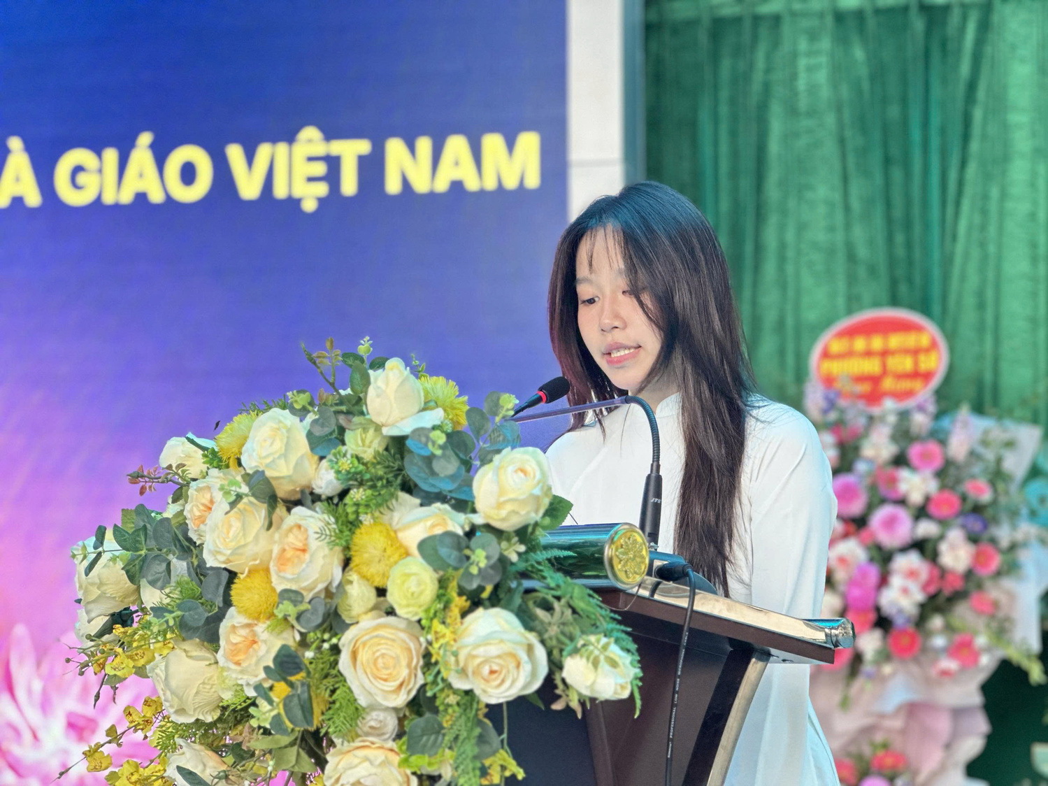 Đại diện Học sinh Nhà trường phát biểu tại Lễ kỷ niệm Buổi lễ gặp mặt nhân dịp kỷ niệm 43 năm Ngày Nhà giáo Việt Nam 20/11 đã khép lại trong không khí ấm áp, tràn đầy yêu thương và tự hào - dấu ấn đầu tiên đẹp đẽ trong hành trình xây dựng và trưởng thành của Trường THPT Đỗ Mười.