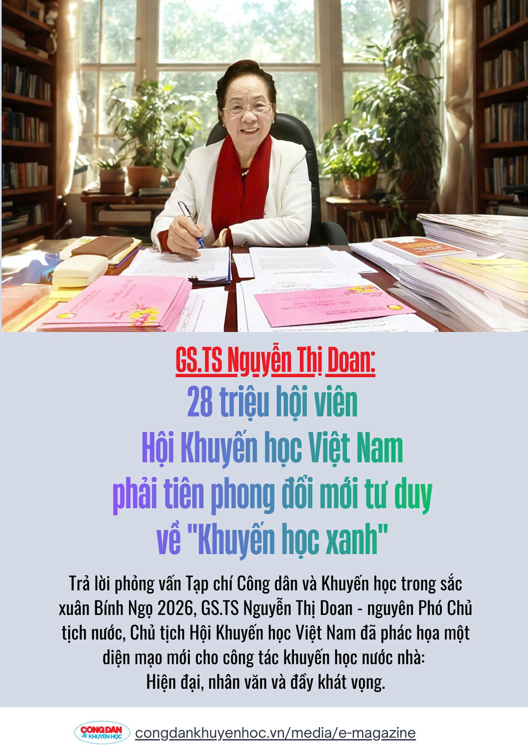 Trả lời phỏng vấn của Tạp chí Công dân và Khuyến học trong sắc Xuân Bính Ngọ 2026 Bính Ngọ 2026, GS.TS.Nguyễn Thị Doan - Nguyên Uỷ viên Trung ương Đảng, Nguyên Phó Chủ tịch nước, Chủ tịch Hội Khuyến học Việt Nam đã phác họa một diện mạo mới cho công tác khuyến học nước nhà: Hiện đại, nhân văn và đầy khát vọng.