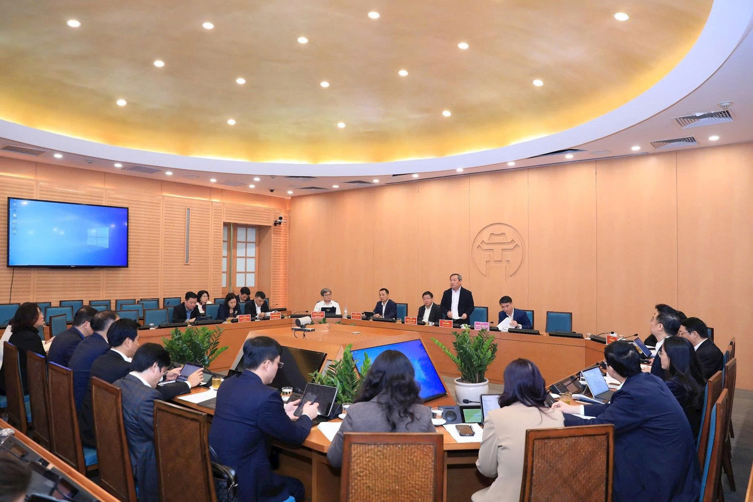 Đồng chí Vũ Đại Thắng - Ủy viên Trung ương Đảng, Phó Bí thư Thành ủy, Bí thư Đảng ủy, Chủ tịch UBND thành phố Hà Nội chủ trì cuộc họp. Tham dự có các đồng chí Phó Bí thư Đảng ủy, Ủy viên Ban Thường vụ Đảng ủy UBND Thành phố, các đồng chí Phó Chủ tịch UBND thành phố Hà Nội; lãnh đạo các ban Đảng Thành ủy; Giám đốc, Thủ trưởng các sở, ban, ngành, đơn vị liên quan. Cuộc họp được tổ chức trực tiếp kết hợp trực tuyến qua hệ thống iCabinet.