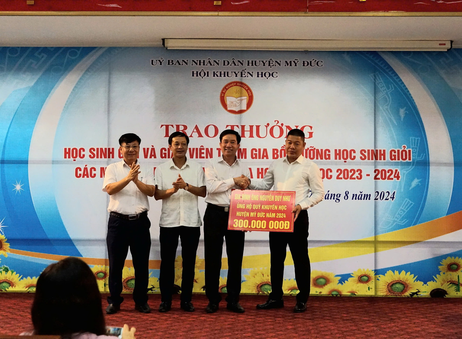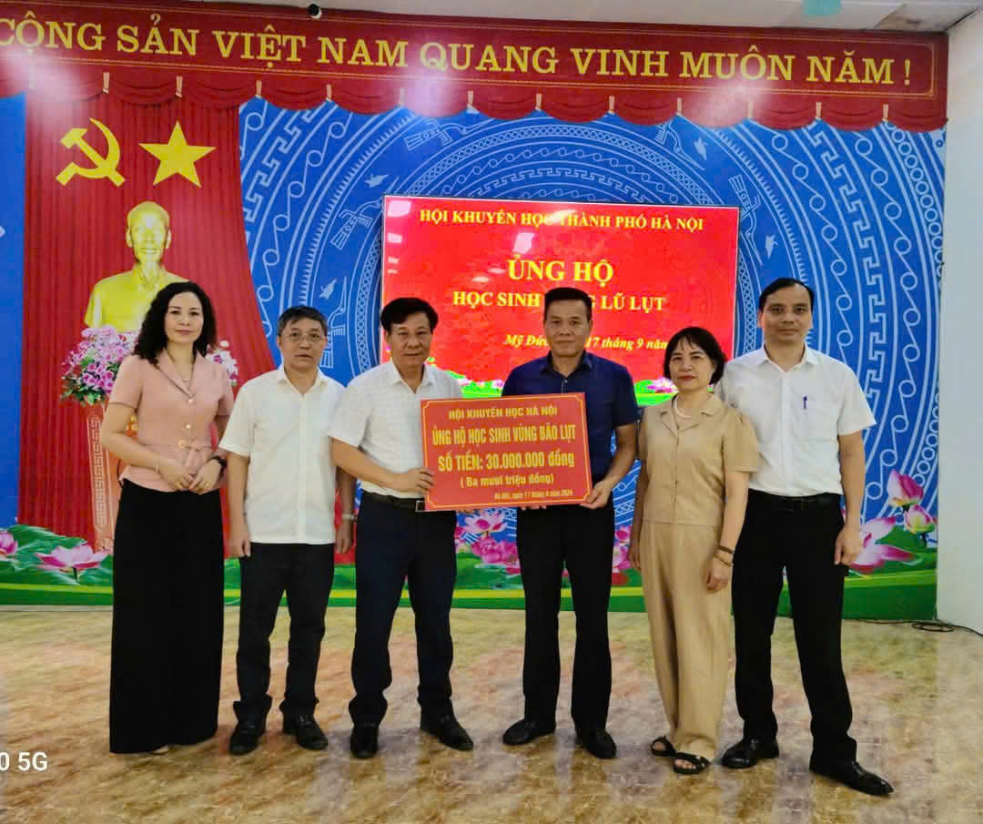 Ngay sau khi tiếng trống khai trường năm học mới, năm học 2024-2025, cơn bão Yagy đổ bộ vào Việt Nam đã gây tổn thất rất lớn cho đồng bào các tỉnh, thành phố phía Bắc, trong đó có huyện Mỹ Đức cũng bị ảnh hưởng hết sức nặng nề. Nhiều địa bàn trong huyện bị ngập sâu, nhiều trường học phải tạm cho học sinh dừng đến trường, nhiều gia đình phải di dời tránh lũ. Và cũng trong sự khó khăn ấy những cán bộ khuyến học các cấp, các thầy, cô giáo lại sẵn sàng vì học sinh thân yêu. Hình ảnh nhiều thầy, cô giáo xuyên đêm di dời trang thiết bị, đồ dùng dạy học đến nơi an toàn; Những lớp học, hội trường đã trở thành nơi nội trú cho học sinh với những bữa cơm miễn phí ấm áp tình thầy trò. Hình ảnh Thầy Hiệu trưởng chèo thuyền đến thăm, động viên, tặng quà cho các em học sinh thân yêu, Cô Hiệu trưởng ôm quần áo của các con về nhà tranh thủ gặt giũ, là ủi thơm tho để các con sạch sẽ ở lại trường duy trì việc học để cho bố mẹ yên tâm ở nhà chiến đấu với từng xentimet nước dâng. Hình ảnh các cô giáo tắm gội cho học sinh, chăm lo từng bữa ăn, giấc ngủ như những đứa con thân yêu của mình. Đó là những hình ảnh vô cùng đẹp đẽ của những người lái đò thầm lặng trên quê hương Mỹ Đức thân yêu. Và nữa, trên 1 tỷ 700 triệu đồng thầy và trò vùng lũ nhận được là minh chứng cho tấm lòng của các cấp ủy Đảng, chính quyền, các cơ quan, ban, ngành, đoàn thể, các thầy, cô giáo, các em học sinh trong và ngoài huyện, trong đó tấm lòng của những người làm công tác khuyến học, khuyến tài luôn tiên phong và tạo được sự lan tỏa mạnh mẽ.