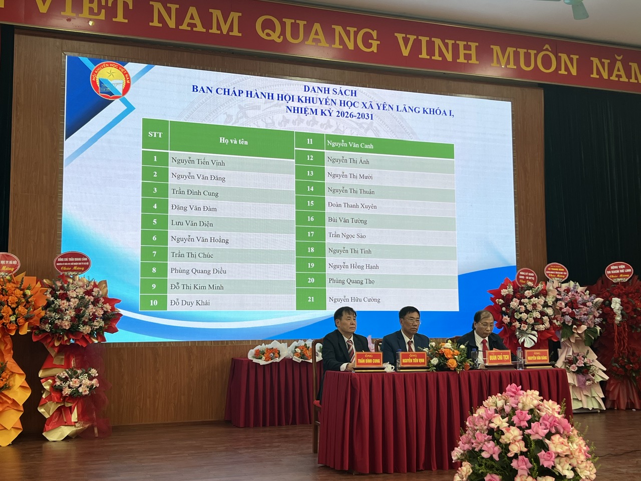 Đại hội đã tiến hành hiệp thương bầu cử Ban Chấp hành Hội Khuyến học xã Yên Lãng gồm 21 Uỷ viên đại diện cho các tổ chức Khuyến học của xã. Tại phiên họp thứ nhất của Ban Chấp hành Hội Khuyến học xã Yên Lãng khoá I, nhiệm kỳ 2026-2031 đã bầu Ban Thường vụ gồm 07 Uỷ viên; bầu Chủ tịch và 03 Phó Chủ tịch Hội, gồm: Ông Nguyễn Tiến Vịnh - Chủ tịch Hội; các Phó Chủ tịch: Ông Nguyên Văn Đăng, Ông Trần Đình Cung và Ông Đặng Văn Đàm; với tỷ lệ tán thành 100% của các Uỷ viên Ban Chấp hành Hội Khuyến học xã Yên Lãng.