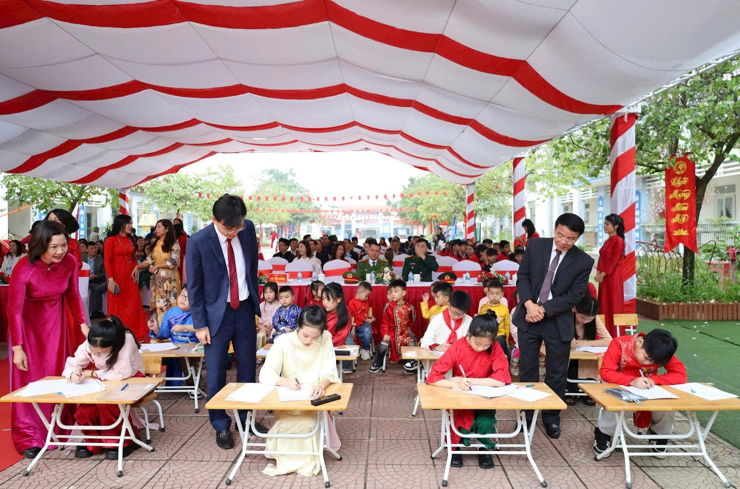 Trong không khí trang nghiêm của buổi lễ, các đồng chí lãnh đạo phường Tùng Thiện đã thực hiện nghi thức khai bút, viết lên 5 chữ vàng: “Trí, Minh, Đạt, Thành, Tín”. Những nét chữ rắn rỏi, bay bổng mang theo kỳ vọng về trí tuệ sáng suốt, sự thành đạt và uy tín dành tặng cho các em và Nhân dân địa phương.