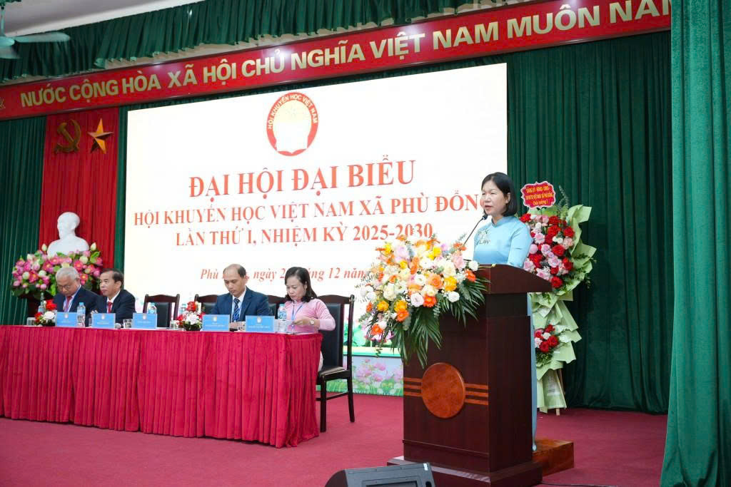 Phát biểu tại Đại hội, Phó Chủ tịch UBND xã Phù Đổng Nguyễn Đình Quang cho biết: Sau khi triển khai thực hiện mô hình chính quyền địa phương hai cấp, mặc dù địa bàn rộng, quy mô dân số lớn, tổ chức Hội được hợp nhất từ nhiều đơn vị các xã trước đây, song Hội Khuyến học xã Phù Đổng đã rất nỗ lực, chủ động, đoàn kết, từng bước ổn định công tác tổ chức Hội và đạt được nhiều kết quả rõ nét. Toàn xã hiện có 84 Chi hội Khuyến học, với trên 25 nghìn hội viên tham gia sinh hoạt. Phong trào xây dựng xã hội học tập tiếp tục được duy trì và lan tỏa sâu rộng; tỷ lệ “Gia đình học tập”, “Dòng họ học tập”, “Cộng đồng học tập”, “Đơn vị học tập” đều đạt mức cao. Trong nhiệm kỳ vừa qua, Hội Khuyến học xã đã phối hợp chặt chẽ với các nhà trường, các tổ chức đoàn thể, tổ chức Hội quần chúng và khu dân cư để tổ chức khen thưởng, động viên hơn 21.700 học sinh giỏi; gần 1.000 học sinh trúng tuyển đại học công lập; trên 2.400 cán bộ, giáo viên có thành tích trong công tác giảng dạy và bồi dưỡng học sinh. Riêng tại khu dân cư, các Chi hội Khuyến học đã kịp thời biểu dương, khen thưởng 4.787 học sinh đạt thành tích các cấp, với tổng kinh phí trên 560 triệu đồng, qua đó tạo không khí thi đua học tập sôi nổi, lan tỏa rộng khắp trong cộng đồng.