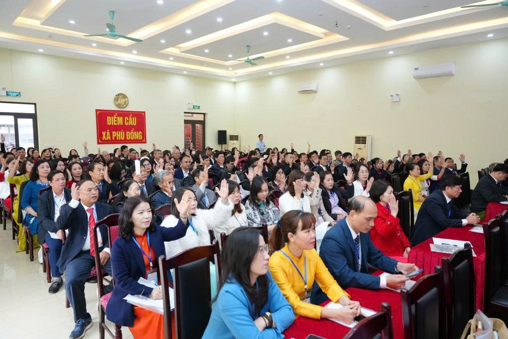 Các đại biểu biểu quyết thông qua dự thảo Nghị quyết Đại hội “Với truyền thống hiếu học của quê hương Phù Đổng, cùng tinh thần đoàn kết, trách nhiệm và tâm huyết của đội ngũ cán bộ Hội, tôi tin tưởng rằng Hội Khuyến học xã Phù Đổng nhiệm kỳ 2025-2030 sẽ hoàn thành tốt Nghị quyết Đại hội đề ra, tiếp tục lan tỏa mạnh mẽ phong trào học tập suốt đời, đóng góp tích cực vào sự phát triển bền vững của địa phương”, đồng chí Nguyễn Đình Quang nhấn mạnh.