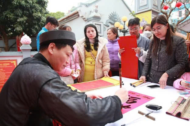 Các thầy, cô giáo, học sinh và nhân dân huyện Thanh Trì xếp hàng xin chữ đầu năm
