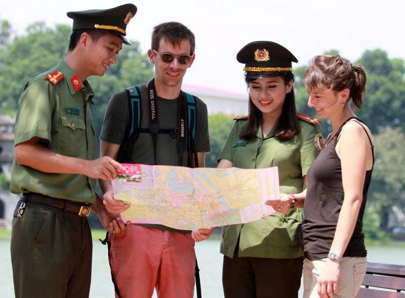 Chiến sĩ Công an thành phố Hà Nội hỗ trợ khách