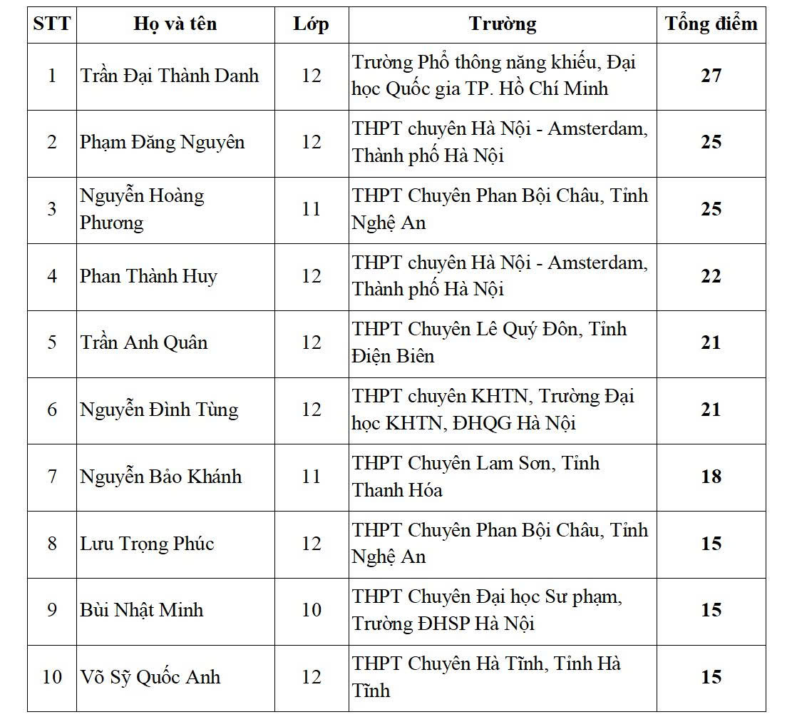Dưới đây là danh sách 10 thí sinh đạt điểm cao nhất (xếp thứ tự tổng điểm từ cao xuống thấp) của đoàn học sinh Việt Nam dự thi Olympic Toán học châu Á. Danh sách này sẽ được gửi tới Hội đồng quốc tế của kỳ thi để tranh tài thứ hạng (Huy chương Vàng, Bạc, Đồng) cùng học sinh của các nước tham dự kỳ thi.