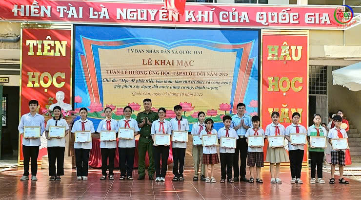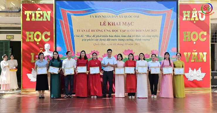 Nhân dịp này, UBND xã Quốc Oai đã khen thưởng 39 cá nhân là các thầy, cô giáo và học sinh có thành tích xuất sắc trong phong trào thi đua "Học tập suốt đời" năm 2025. Đây là những tấm gương tiêu biểu, góp phần thúc đẩy phong trào học tập, xây dựng xã hội học tập trên địa bàn.