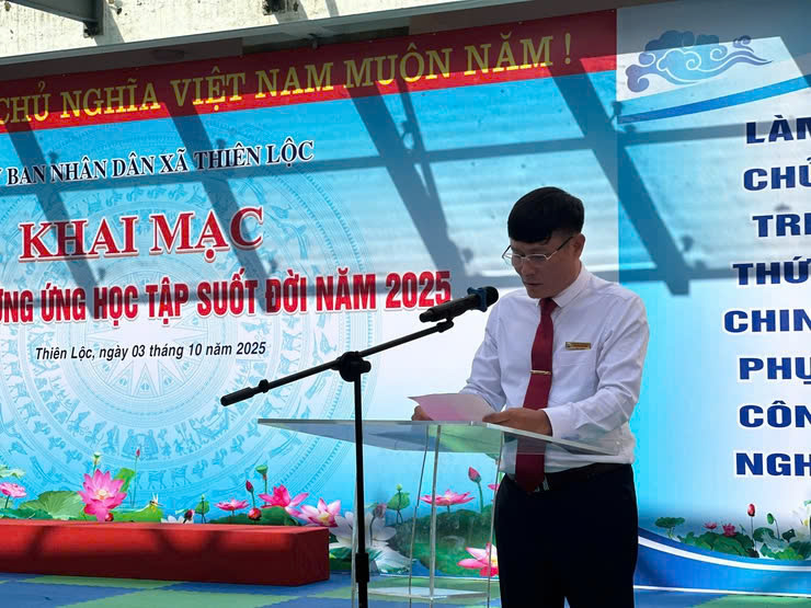 phát động Tuần lễ hưởng ứng học tập suốt đời năm 2025 Phát biểu tại Lễ khai mạc, đồng chí Nguyễn Thị Nhàn - Trưởng phòng Văn hóa Xã hội xã Thiên Lộc nhấn mạnh: "Học để phát triển bản thân, làm chủ tri thức và công nghệ, góp phần xây dựng đất nước hùng cường, thịnh vượng" là chủ đề của Tuần lễ hưởng ứng học tập suốt đời năm 2025, nhằm nâng cao nhận thức, tăng cường trách nhiệm, sự quan tâm và tham gia tích cực của các cấp ủy, chính quyền, các ngành, các tổ chức, đoàn thể, lực lượng xã hội đối với việc phát triển văn hóa đọc thúc đẩy học tập suốt đời.