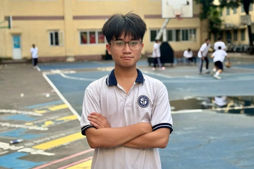 Nguyễn Gia Khánh trong sân Trường THPT Yên Hòa