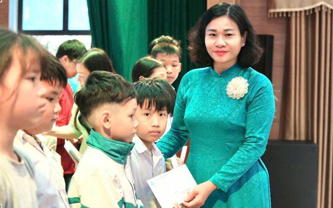 và các đại biểu trao quà cho các em học sinh mồ côi có hoàn cảnh khó khăn