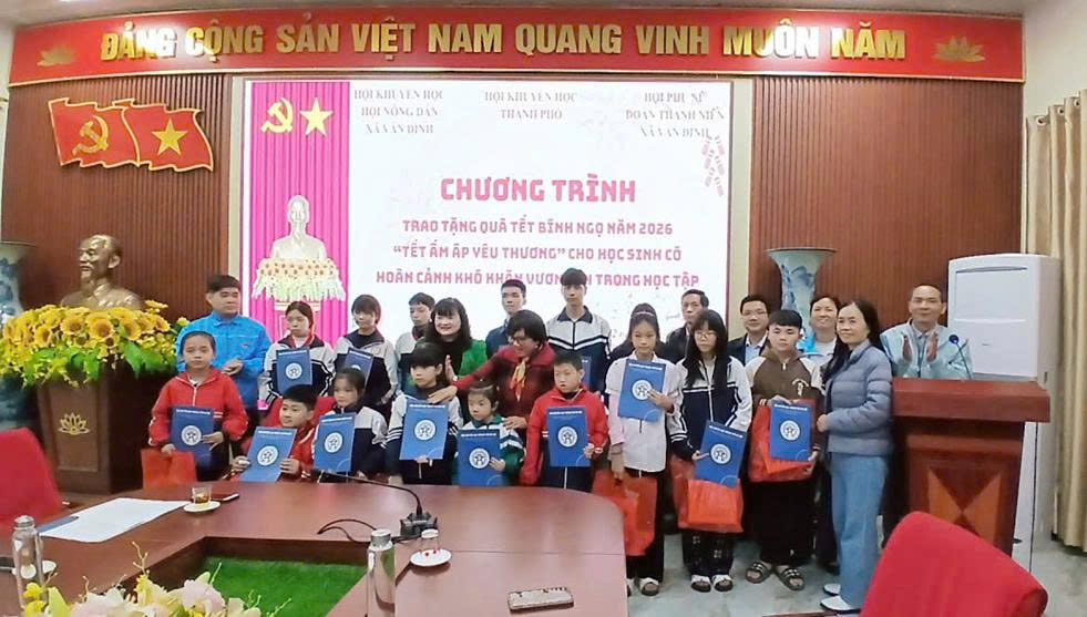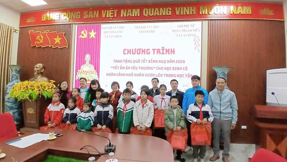 Sáng ngày 04/2/2026, tại Hội trường trực tuyến UBND xã Vân Đình, Hội Khuyến học xã phối hợp với Hội Khuyến học thành phố Hà Nội và các tổ chức chính trị xã hội xã tổ chức trao tặng quà Tết Bính Ngọ 2026 “Tết ấm áp yêu thương” cho trẻ em có hoàn cảnh khó khăn vươn lên trong học tập.