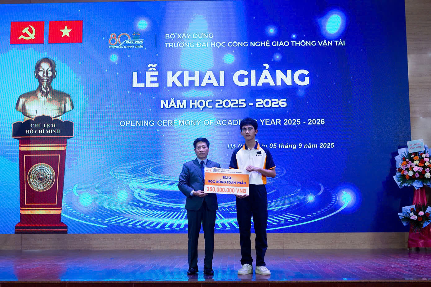 Sáng ngày 5/9/2025, cùng với học sinh, sinh viên cả nước, Trường Đại học Công nghệ Giao thông Vận tải tổ chức Lễ khai giảng năm học mới 2025-2026. Sau phần tiếp sóng Lễ kỷ niệm 80 năm Ngày truyền thống và Lễ khai giảng của Bộ Giáo dục và Đào tạo, Trường Đại học Công nghệ Giao thông Vận tải đã tổ chức Lễ khai giảng, trao học bổng cho Tân Sinh viên.