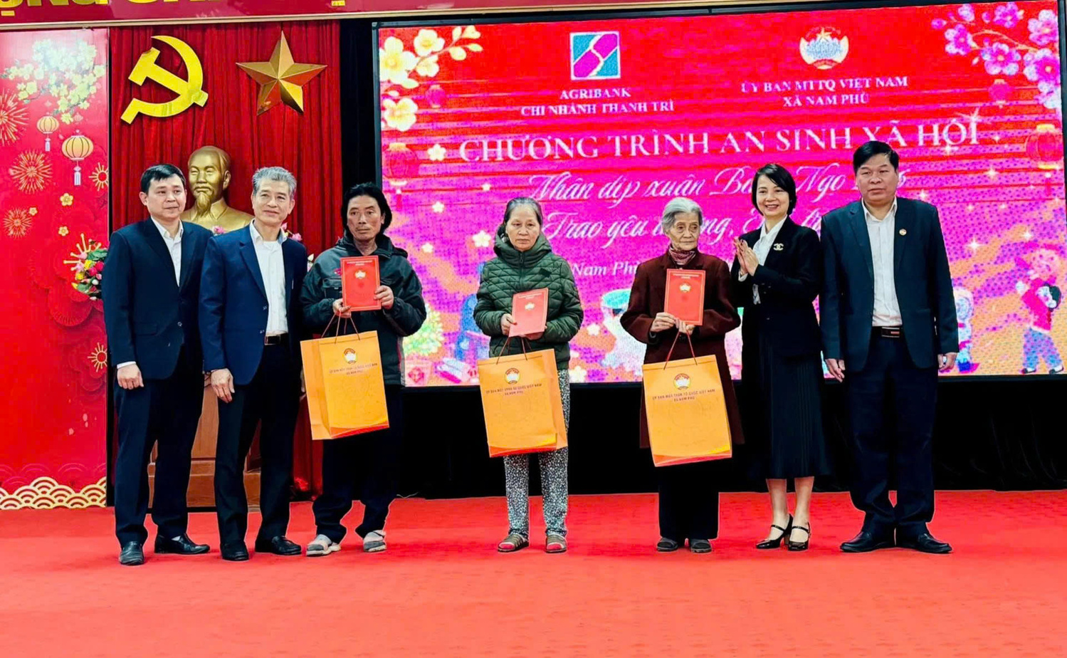 Lãnh đạo xã Nam Phù và lãnh đạo Agribank trao quà cho các hộ khó khăn Tại chương trình, Agribank Chi nhánh Thanh Trì đã trao hỗ trợ 100 triệu đồng để địa phương tổ chức tặng quà Tết cho các hộ khó khăn. Trên cơ sở rà soát, Uỷ ban MTTQ Việt Nam xã đã lập danh sách và trao 200 suất quà đến đúng đối tượng, bảo đảm công khai, minh bạch, kịp thời trước thềm năm mới.