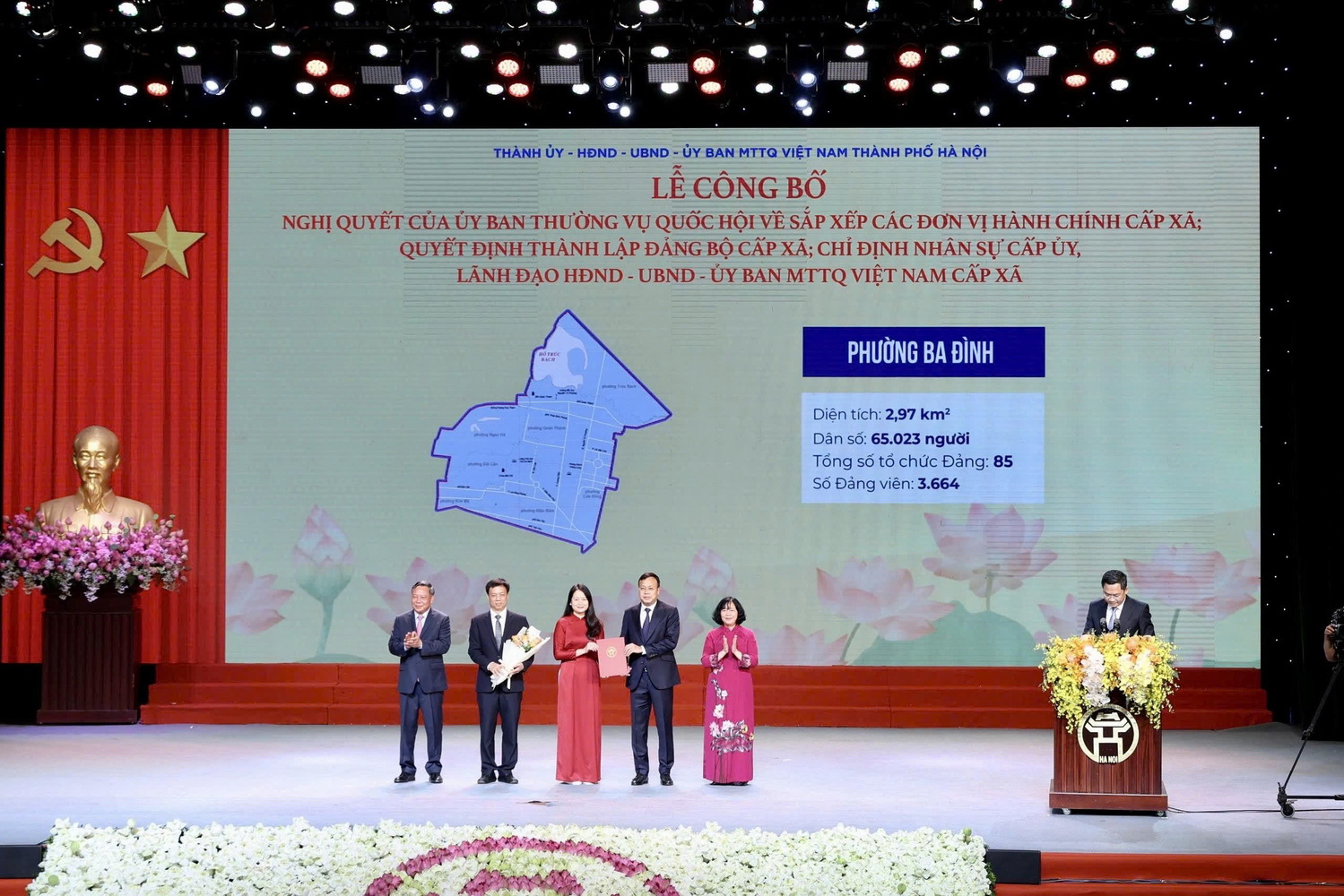 Theo danh sách được Trưởng ban Tổ chức Thành ủy Hà Nội công bố, 3 vị trí lãnh đạo chủ chốt của 126 xã, phường mới của Hà Nội lên sân khấu đón nhận các quyết định như sau: