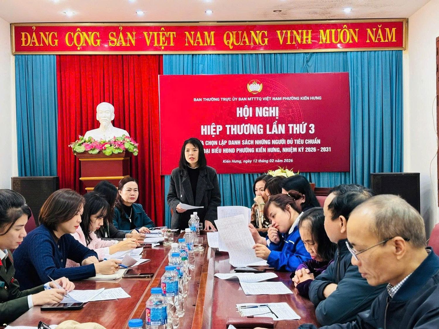 Chủ tịch Ủy ban Mặt trận Tổ quốc Việt Nam phường Kiến Hưng Hoàng Thị Huyền Trang cho biết, quá trình chuẩn bị hiệp thương vòng thứ ba được thực hiện bài bản, hồ sơ được rà soát kỹ lưỡng, không để xảy ra sai sót. Việc xem xét từng trường hợp được thực hiện thận trọng, bảo đảm tiêu chuẩn theo luật định.
