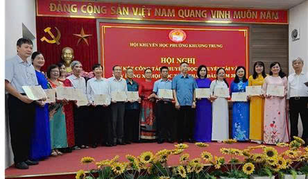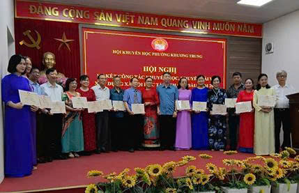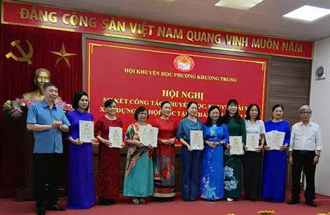 trao thưởng cho các tập thể tiêu biểu Tiến sĩ Tạ Thị Lệ Yên - Chủ tịch Hội Khuyến học phường Khương Trung và ông Nguyễn Anh Dũng - Phó Chủ tịch Ủy ban Mặt trận Tổ quốc phường Khương Trung trao thưởng cho các cán bộ, hội viên và các tập thể tiêu biểu.