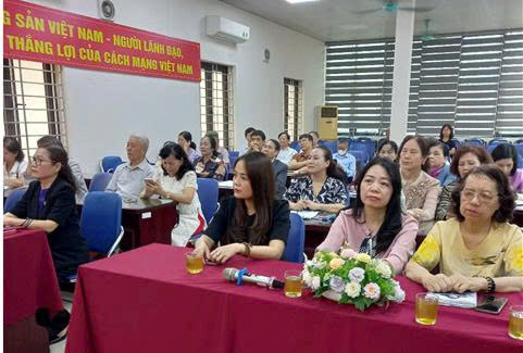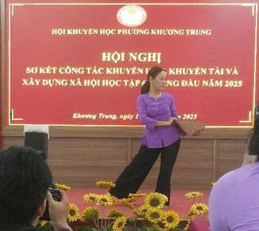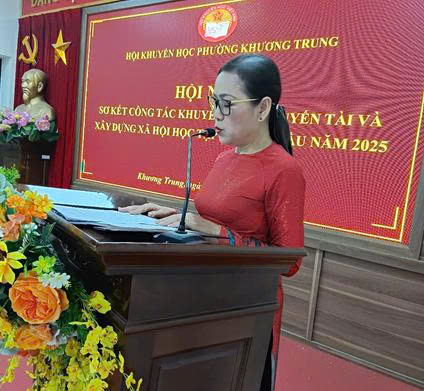 Tiến sĩ Tạ Thị Lệ Yên - Chủ tịch Hội Khuyến học phường Khương Trung khai mạc và thay mặt Ban Chấp hành Hội báo cáo kết quả công tác khuyến học, khuyến tài, xây dựng xã hội học tập phường trong 6 tháng đầu năm năm 2025.