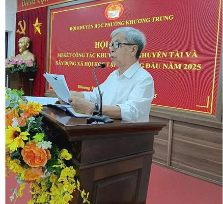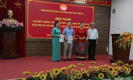 trao thưởng cho các cá nhân tiêu biểu Nhằm động viên phong trào khuyến học, khuyến tài, xây dựng xã hội học tập trên địa bàn phường, ông Đinh Quang Nhự - Ủy viên Ban Thường vụ Hội Khuyến học phường Khương Trung công bố quyết định khen thưởng của Ban Chấp hành Hội tặng cho các cán bộ, hội viên và các tập thể có thành tích xuất sắc trong hoạt động khuyến học 6 tháng đầu năm 2025.