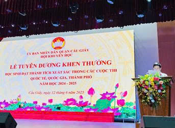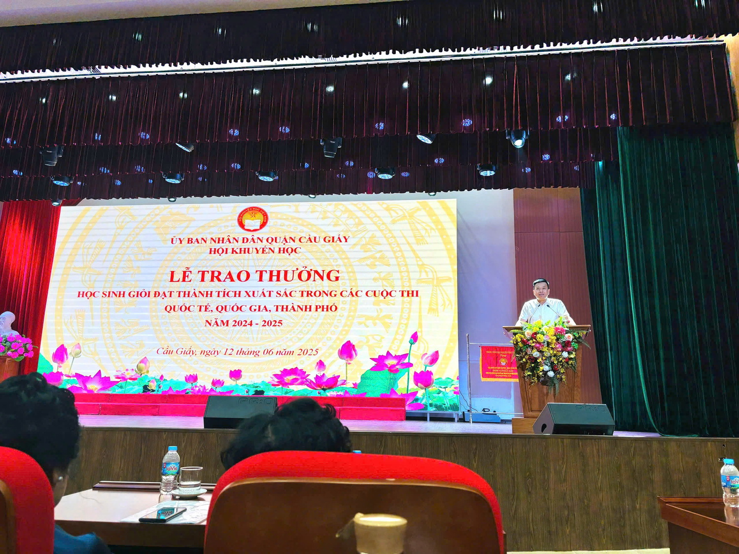 Thực hiện việc sắp xếp đơn vị hành chính các cấp và xây dựng mô hình tổ chức chính quyền địa phương 2 cấp theo Nghị quyết số 60-NQ/TW ngày 12/4/2025 của Hội nghị lần thứ 11 Ban Chấp hành Trung ương Đảng khóa XIII; Ngày 12 tháng 6 năm 2025 tại Hội trường UBND quận Cầu Giấy, Hội Khuyến học quận đã long trọng tổ chức lễ Tuyên dương, khen thưởng các em học sinh đạt thành tích cao trong các cuộc thi Quốc tế, Quốc gia và Thành phố năm học 2024-2025.