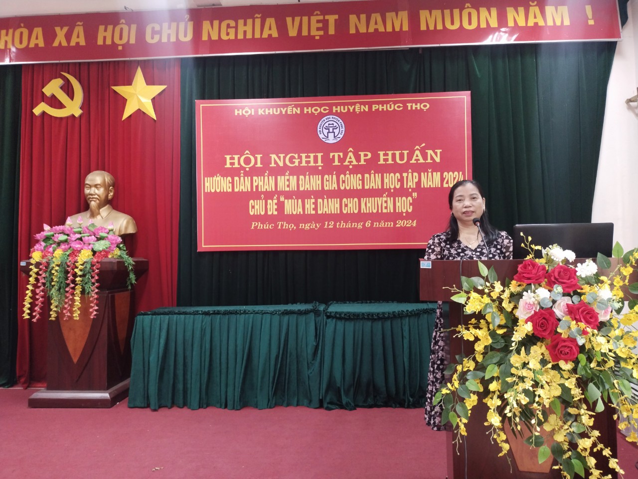 Thực hiện Kế hoạch hoạt động của Hội Khuyến học huyện Phúc Thọ năm 2024; Ngày 12/6/2024 Ban Chấp hành Hội Khuyến học huyện Phúc Thọ đã tổ chức Hội nghị tập huấn hướng dẫn sử dụng phần mềm đánh giá “Công dân học tập” năm 2024 theo Quyết định số 677/QĐ-TTg ngày 03/6/2022 của Thủ tướng Chính phủ và các văn bản hường dẫn của Trung ương Hội Khuyến học Việt Nam, của UBND thành phố Hà Nội và Hội Khuyến học Hà Nội; với chủ đề: “Mùa Hè dành cho khuyến học” tại huyện Phúc Thọ đã thành công tốt đẹp.