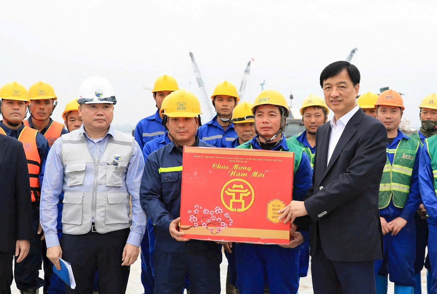 với các đơn vị thi công cầu Hồng Hà. Ảnh: Quang Thái