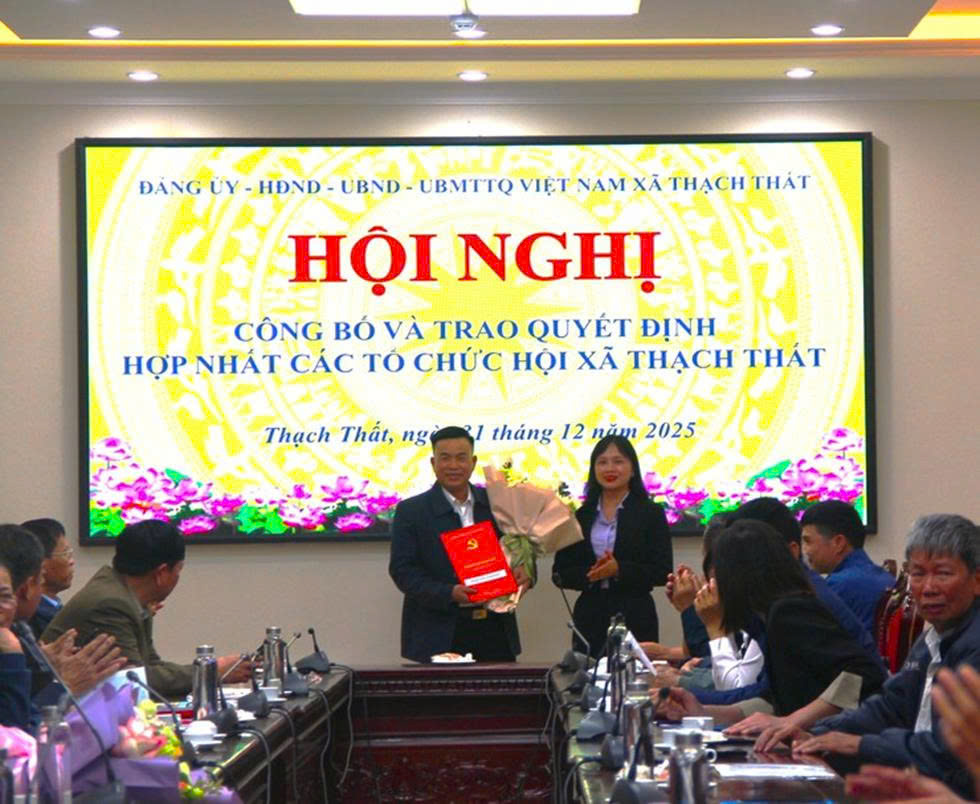 Đại diện lãnh đạo xã trao Quyết định thành lập Hội quần chúng xã 7. Quyết định số 2010/QĐ-UBND ngày 28/11/2025 của UBND xã Thạch Thất về việc cho phép hợp nhất Hội Liên hiệp thanh niên Việt Nam Thị trấn Liên Quan, xã Phú Kim, xã Cẩm Yên, xã Kim Quan, xã Lại Thượng, xã Đại Đồng thành Hội Liên hiệp thanh niên Việt Nam xã Thạch Thất, thành phố Hà Nội;