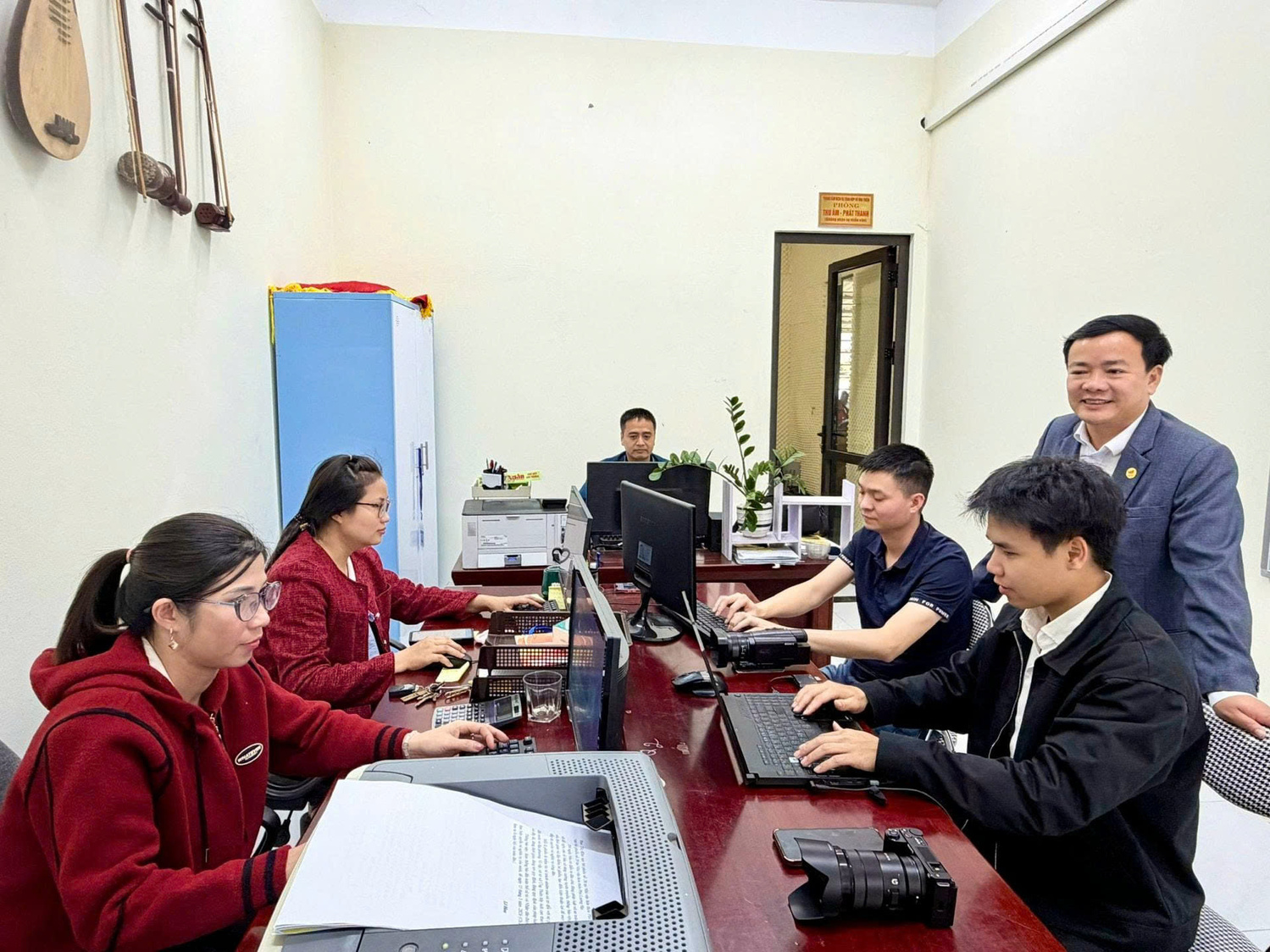 (người đứng) cùng các cán bộ, nhân viên Trung tâm hăng say làm việc