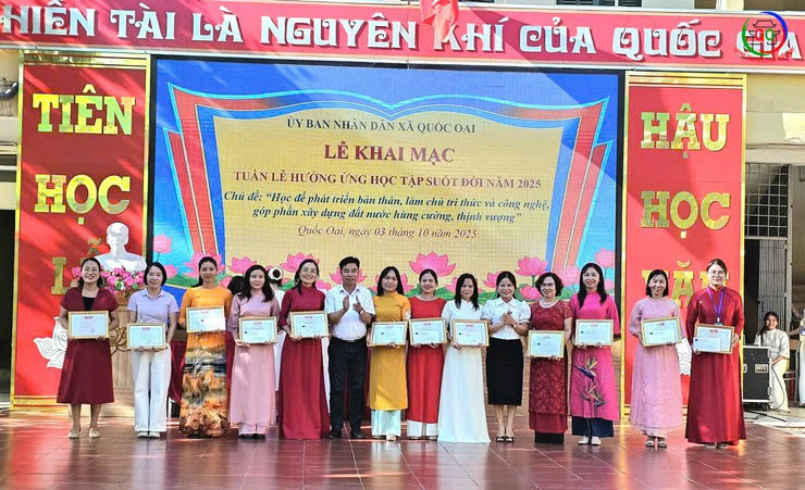 Nhân dịp này, UBND xã Quốc Oai đã khen thưởng 39 cá nhân là các thầy, cô giáo và học sinh có thành tích xuất sắc trong phong trào thi đua "Học tập suốt đời" năm 2025. Đây là những tấm gương tiêu biểu, góp phần thúc đẩy phong trào học tập, xây dựng xã hội học tập trên địa bàn.