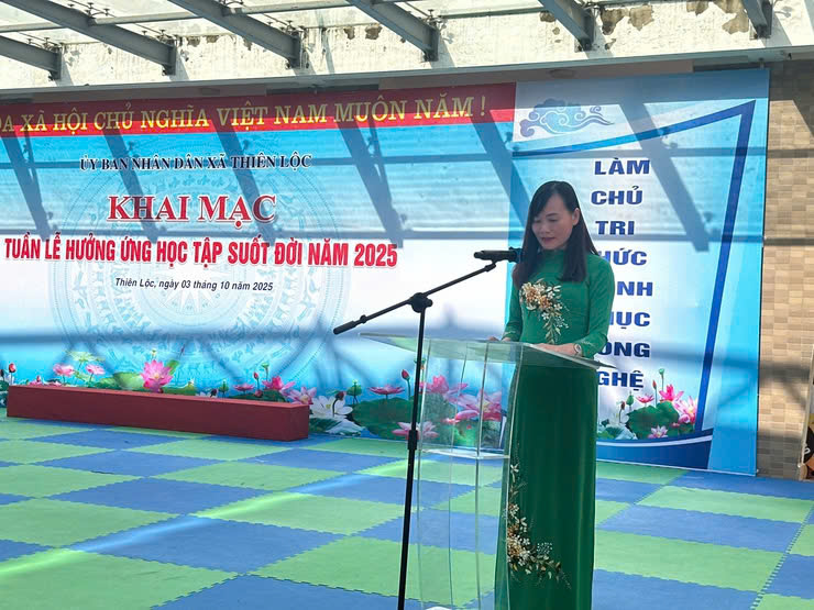 phát động Tuần lễ hưởng ứng học tập suốt đời năm 2025 Phát biểu tại Lễ khai mạc, đồng chí Nguyễn Thị Nhàn - Trưởng phòng Văn hóa Xã hội xã Thiên Lộc nhấn mạnh: "Học để phát triển bản thân, làm chủ tri thức và công nghệ, góp phần xây dựng đất nước hùng cường, thịnh vượng" là chủ đề của Tuần lễ hưởng ứng học tập suốt đời năm 2025, nhằm nâng cao nhận thức, tăng cường trách nhiệm, sự quan tâm và tham gia tích cực của các cấp ủy, chính quyền, các ngành, các tổ chức, đoàn thể, lực lượng xã hội đối với việc phát triển văn hóa đọc thúc đẩy học tập suốt đời.