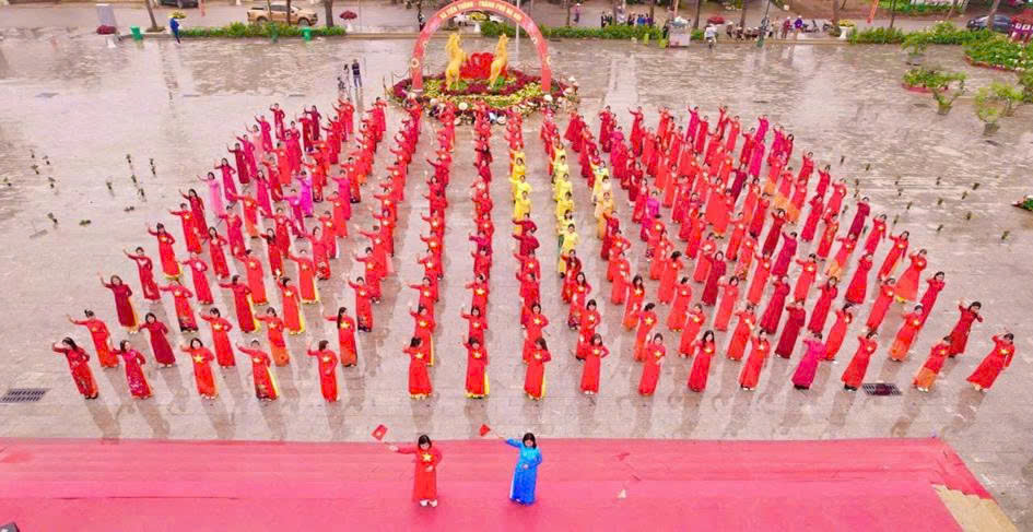 Phụ nữ xã Tiến Thắng mặc áo dài đồng diễn dân vũ chào mừng ngày bầu cử