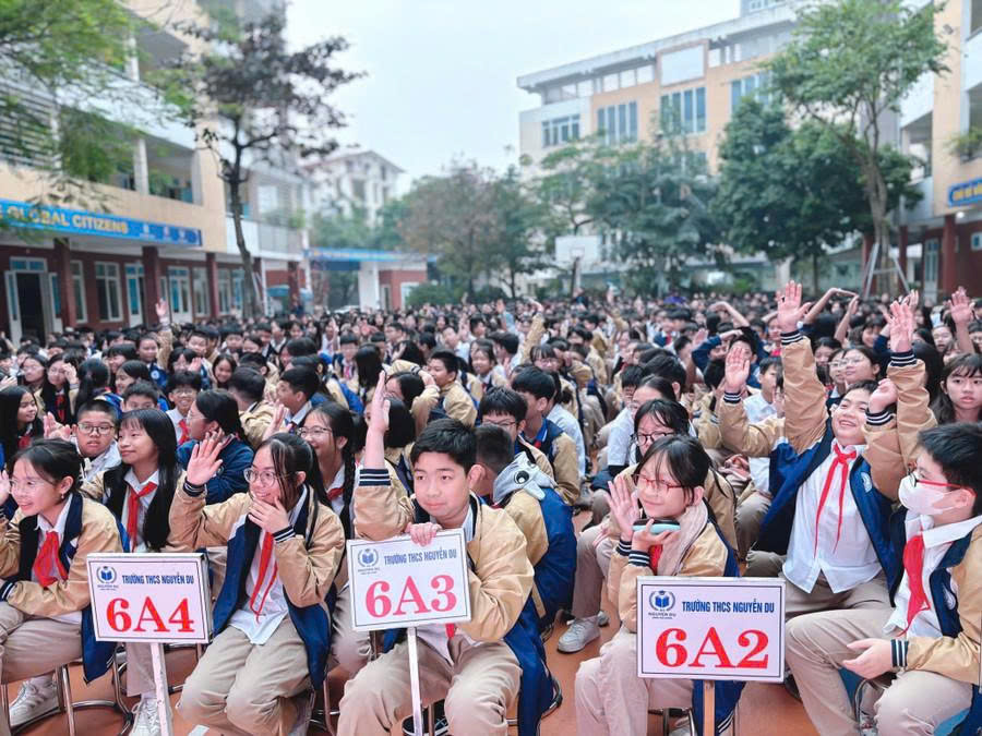 Học sinh Trường THCS Nguyễn Du trong một hoạt động dưới sân trường Từ thực tiễn giảng dạy ở cơ sở, cô Lê Thanh Huyền - giáo viên tiếng Anh tại Trường Tiểu học Châu Sơn, xã Cổ Đô, Hà Nội chia sẻ, để việc dạy tiếng Anh bắt buộc từ lớp 1 đạt hiệu quả cần thực hiện đồng bộ ba nhóm giải pháp chính: Con người - Chương trình - Công nghệ. Cần xây dựng chương trình, tài liệu học tập thân thiện và phù hợp với lứa tuổi lớp 1, trong đó ưu tiên phát triển năng lực nghe - nói, khả năng cảm thụ ngữ âm, không đặt nặng ngữ pháp hay từ vựng hàn lâm. Mục tiêu giai đoạn đầu nên là giúp trẻ yêu thích tiếng Anh, tự tin giao tiếp những câu đơn giản, hình thành thái độ tích cực với môn học. "Đặc biệt, nên đẩy mạnh ứng dụng công nghệ và trí tuệ nhân tạo (AI) trong dạy học tiếng Anh, đặc biệt ở các vùng còn thiếu giáo viên và thiết bị. Các công cụ như video hoạt hình tương tác, sách truyện số (storybook), hoặc nhân vật AI hướng dẫn bài học có thể giúp giờ học trở nên sinh động, khơi gợi hứng thú tự nhiên cho học sinh" - cô Lê Thanh Huyền trao đổi.