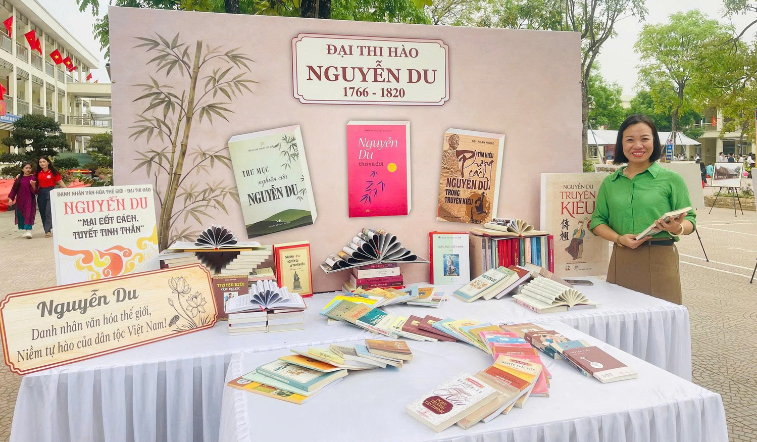 tại gian trưng bày xếp sách nghệ thuật của thầy trò nhà trường