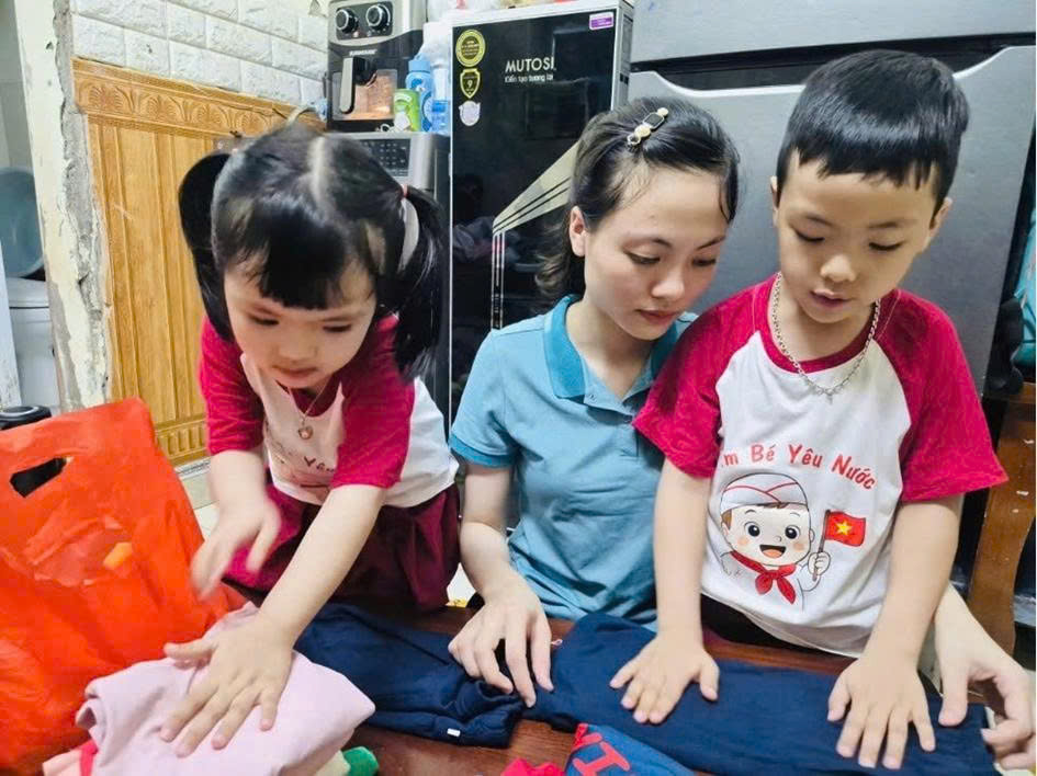 Rồi đến một ngày, các em được mời mang đến lớp những bộ quần áo còn sử dụng tốt. Không đặt yêu cầu về số lượng “cho nhiều, cho ít”. Có em mang đến một chiếc áo len đã chật, có em mang theo chiếc áo khoác mình từng rất thích. Các em được trực tiếp tham gia vào toàn bộ quá trình với sự đồng hành của phụ huynh: phân loại, gấp gọn, sắp xếp, rồi đặt vào tủ.