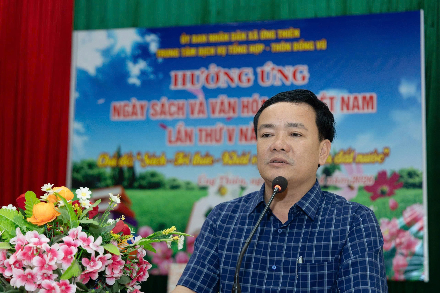 Giám đốc Trung tâm Dịch vụ tổng hợp xã Ứng Thiên Trương Thế Hữu nhấn mạnh vai trò quan trọng của sách và văn hóa đọc trong việc nâng cao tri thức, hình thành nhân cách con người, nhất là trong bối cảnh chuyển đổi số hiện nay. Đồng chí Trương Thế Hữu khẳng định, việc duy trì và phát triển văn hóa đọc là nhiệm vụ thiết thực, góp phần xây dựng xã hội học tập, khơi dậy khát vọng vươn lên, phát triển quê hương, đất nước.