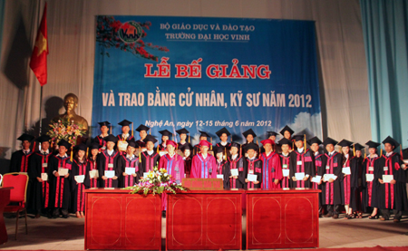 Tối qua 12/6, Trường Đại học Vinh, Nghệ An đã long trọng tổ chức lễ bế giảng và trao bằng cử nhân, kỹ sư năm học 2012 cho sinh viên khoá 49 của nhà trường. Đợt này, ĐH Vinh có 2.872 sinh viên ở tất cả các khoa, ngành đào tạo được xét và công nhận tốt nghiệp. Đây là những sinh viên ở khoá thứ 2 nhà trường triển khai theo chương trình học mới đó đào tạo theo hệ thống tín chỉ.