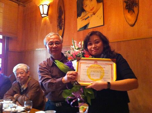 NGND Nguyễn Kim Hoãn- Chủ tịch HKH Hà Nội trao trao Giấy chứng nhận Tấm lòng vàng cho Bà Nguyễn Hằng Nga
