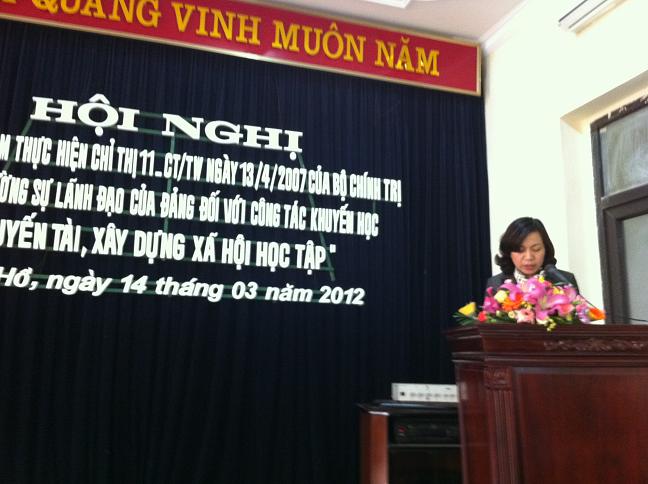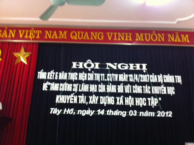 Chiều ngày 14/3/2012, Quận ủy Tây Hồ tổ chức hội nghị tổng kết 5 năm thực hiện Chỉ thị số 11-CT/TW ngày 13/4/2007 về :" Tăng cường sự lãnh đạo của Đảng đối với công tác khuyến học, khuyến tài, xây dựng xã hội học tập". Dự hội nghị có Đồng chí Nguyễn Văn Thắng - Bí thư Quận ủy; Đồng chí Lê Thị Thu Hằng - Phó Bí thư thường trực, Trưởng Ban chỉ đạo XDXHHT; Các đồng chĩ lãnh đạo UBND và HĐND quận; các đồng chí đại diện Ban Tuyên giáo Thành ủy; Trưởng, phó Ban Tuyên giáo quận; Chủ tịch MTTQ; Chủ tịch HKHH quận; các đồng chí Đảng ủy cơ sở' Trưởng Ban chỉ đạo XDXHHT của 8 phường; Phó Chủ tịch phụ trách văn xã của 8 phường; lãnh đạo các ban, ngành và các đồng chí được tặng giấy khen,...