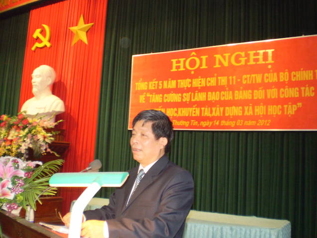 Ngày 14/3/2012, HuyỆN uỷ huyện Thường Tín đã tổ chức hội nghị tổng kết 5 năm thực hiện Chỉ thị 11 của Bộ Chính trị về tăng cường sự lãnh đạo của Đảng đối với công tác khuyến học, khuyến tài, xây dựng xã hội học tập. NGND Nguyễn Kim Hoãn – Chủ tịch Hội Khuyến học Hà Nội, đại diện Ban Khoa giáo Thành uỷ, đồng chí Tô Văn Cường – TUV Bí thư huyện uỷ, lãnh đạo các ban, ngành, lãnh đạo các xã, Hội Khuyến học các cơ sở đã về dự.