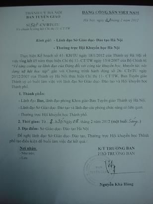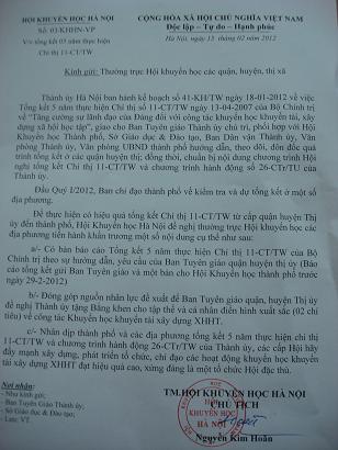Thành Hội khuyến học Hà Nội gửi công văn yêu cầu các HKH quận, huyện tổng kết chỉ thị 11-CT/TW