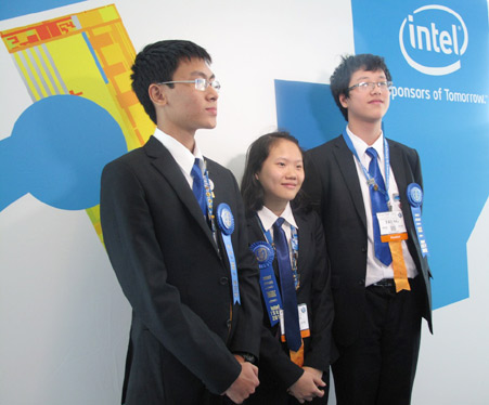 Ba học sinh trường THPT Amterdam - Hà Nội (từ trái qua phải: Vũ Anh Vinh, Bùi Thị Quỳnh Trang và Trần Bách Trung) đoạt giải nhất lĩnh vực Điện và Cơ khí tại Hội thi Khoa học và Kỹ thuật Quốc tế (Intel ISEF) 2012 tại Mỹ. (Ảnh: Tuấn Anh)