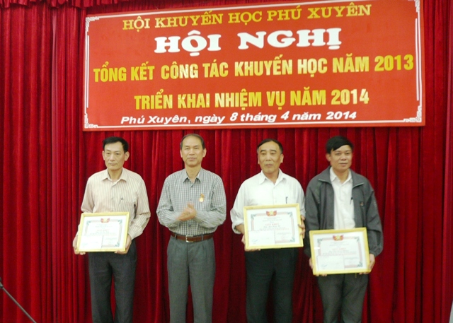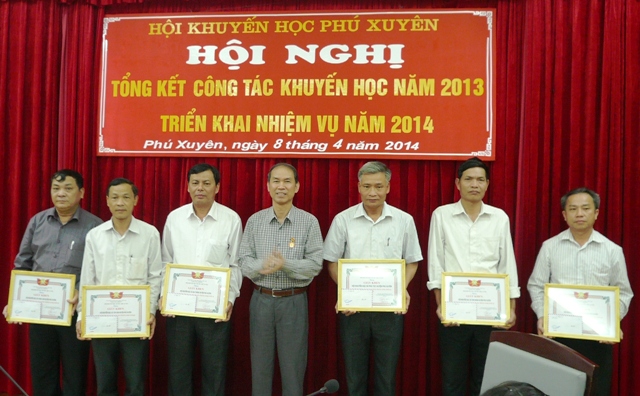 Trao Giấy khen cho các cá nhân Hưởng ứng phong trào thi đua lấy thành tích chào mừng kỷ niệm những ngày lễ lớn trong năm 2013 đặc biệt là năm Kỷ niệm 15 năm thành lập Hội Khuyến học TP Hà Nội, Hội Khuyến học huyện Phú Xuyên và đồng chí Chu Phú Mỹ nguyên Chủ tịch UBND huyện được TW Hội Khuyến học Việt Nam tặng Bằng khen; 04 đồng chí được TW Hội Khuyến học Việt Nam tặng Kỷ niệm chương; Sở GD-ĐT Hà Nội tặng giấy khen của Hội 01 đơn vị (Thị trấn Phú Minh); Hội Khuyến học TP Hà Nội tặng giấy khen cho 02 đơn vị (Xã Phú Yên; Xã Châu Can); Hội Khuyến học huyện tặng giấy khen cho 06 đơn vị và 06 cá nhân. Tại hội nghị các tập thể và cá nhân đã đón nhận phần thưởng trên.