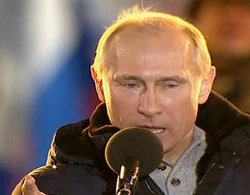 "Chúng ta đã thắng trong một cuộc chiến trung thực và minh bạch", Putin nói, mắt ông ngấn nước và giọng lạc đi vì xúc động. Ônng đứng trên sân khấu cùng với Tổng thống Dmitry Medvedev trên quảng trường Manezh.