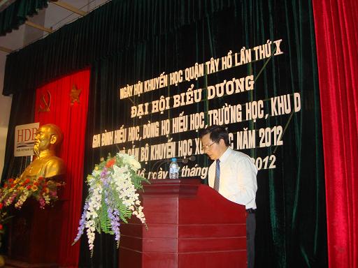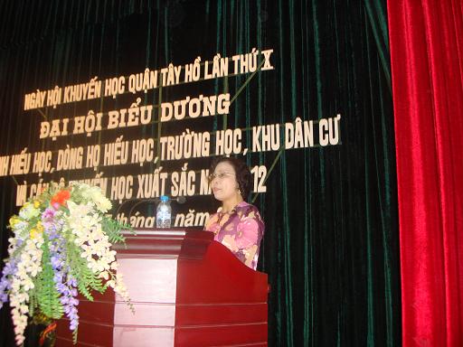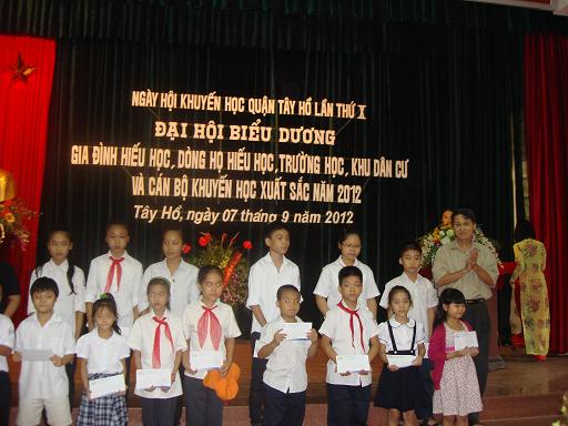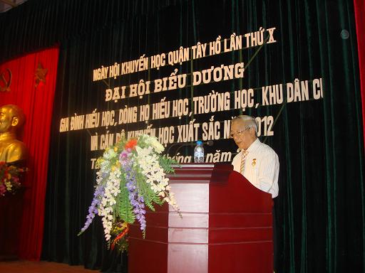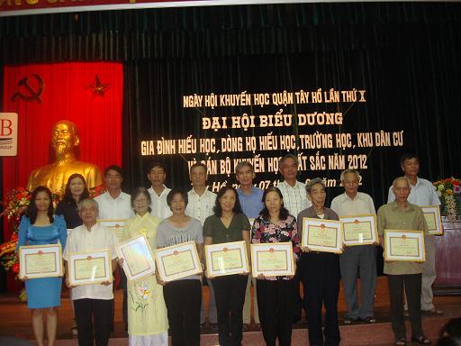 Sáng nay 07/09/2012, UBND quận, Hội Khuyến học quận Tây Hồ đã tổ chức Đại hội biểu dương gia đình hiếu học, dòng họ hiếu học, cộng đồng khuyến học xuất sắc năm 2012. Đây là quận đầu tiên của Thành phố tổ chức đại hội theo yêu cầu của Trung ương hội và Hội Khuyến học Hà Nội. Dự đại hội có các đại biểu Trung ương hội, Hội Khuyến học Hà Nội và các đồng chí lãnh đạo Quận ủy, UBND quận tây hồ : Ông Nguyễn Thanh Nghị - uỷ viên thường vụ Trung ương hội Khuyến học Việt Nam; ông Phan Việt Huy - Thường vụ, Trưởng ban Tuyên truyền Hội Khuyến học Hà Nội; ông Nguyễn Văn Thắng - Bí thư quận ủy, Chủ tịch HĐND; Ông Nguyễn Phúc Quang - Chủ tịch UBND quận Tây Hồ và các đòng chí lãnh đạo , trưởng các ban ngành của Quận ủy, UBND quận Tây Hồ; Các đồng chí lãnh đạo Hội Khuyến học quận và tập thể, cá nhân xuất sắc trong phong trào khuyến học trong 5 năm qua của quận Tây Hồ,...