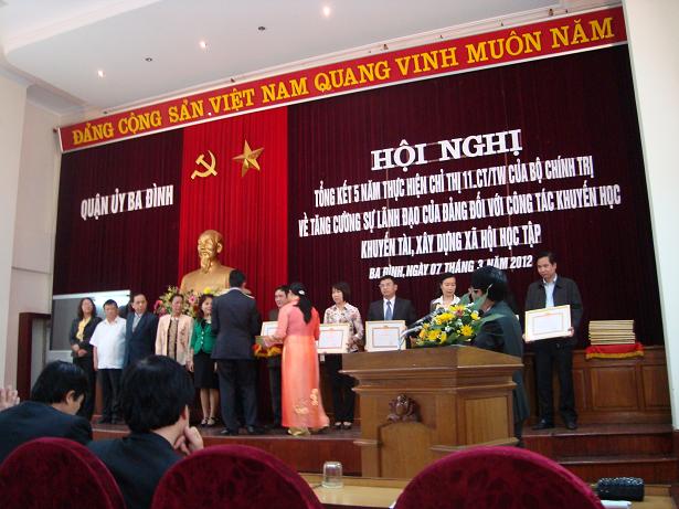 Sáng qua 7/3/2012, Quận uỷ Ba Đình tổ chức tổng kết 5 năm thực hiện Chỉ thị 11-CT/TW ngày 13/7/2007 của Bộ Chính trị về " Tăng cường sự lãnh đạo của Đảng với công tác khuyến học, khuyến tài, xây dựng xã hội học tập". Đại biểu Thành phố tham dự có: